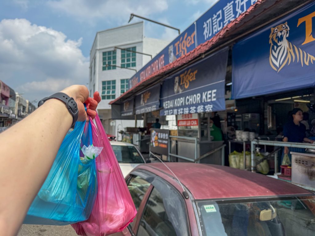 🇩🇪 Ipoh ist bekannt für gutes Essen. An einem entspannten Tag ist es daher sehr schön, einfach ein paar Food-Spots abzuklappern, leckere Snacks zu genießen und ein wenig shoppen zu gehen. Wir starteten den Tag mit Essen zum Mitnehmen aus einem Kopitiam im Ipoh Garden (ja, Take-away kommt dort meist in irgendeiner Art von Plastiktüte – auch der Kaffee (Kopi)).