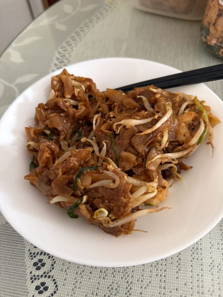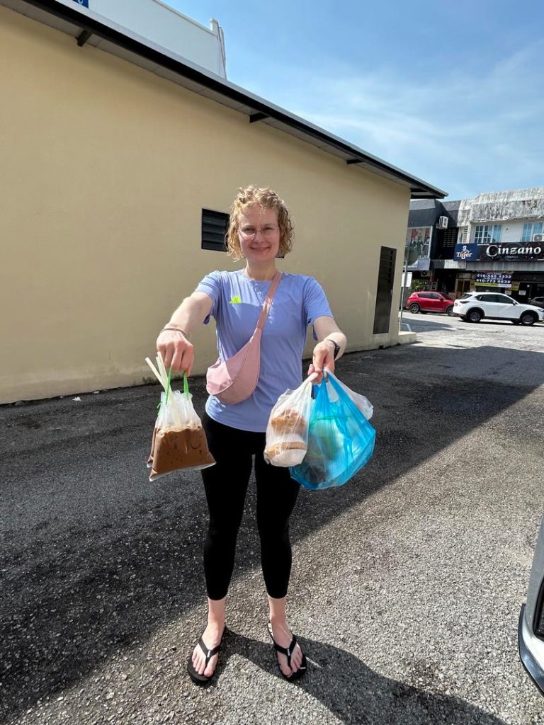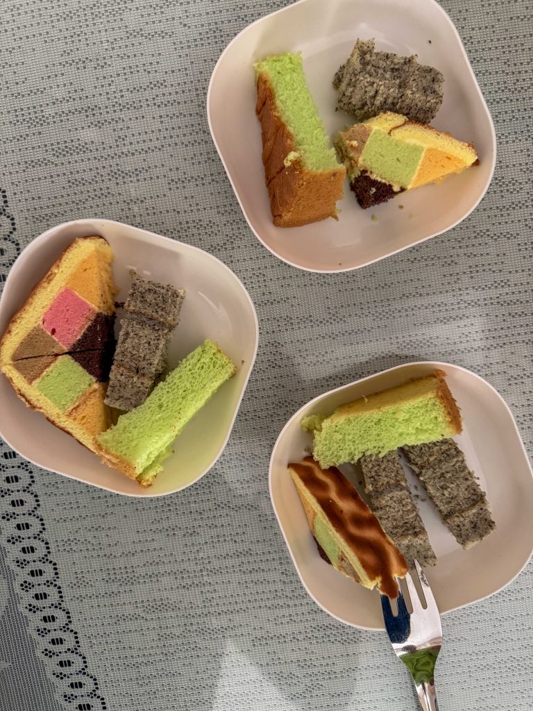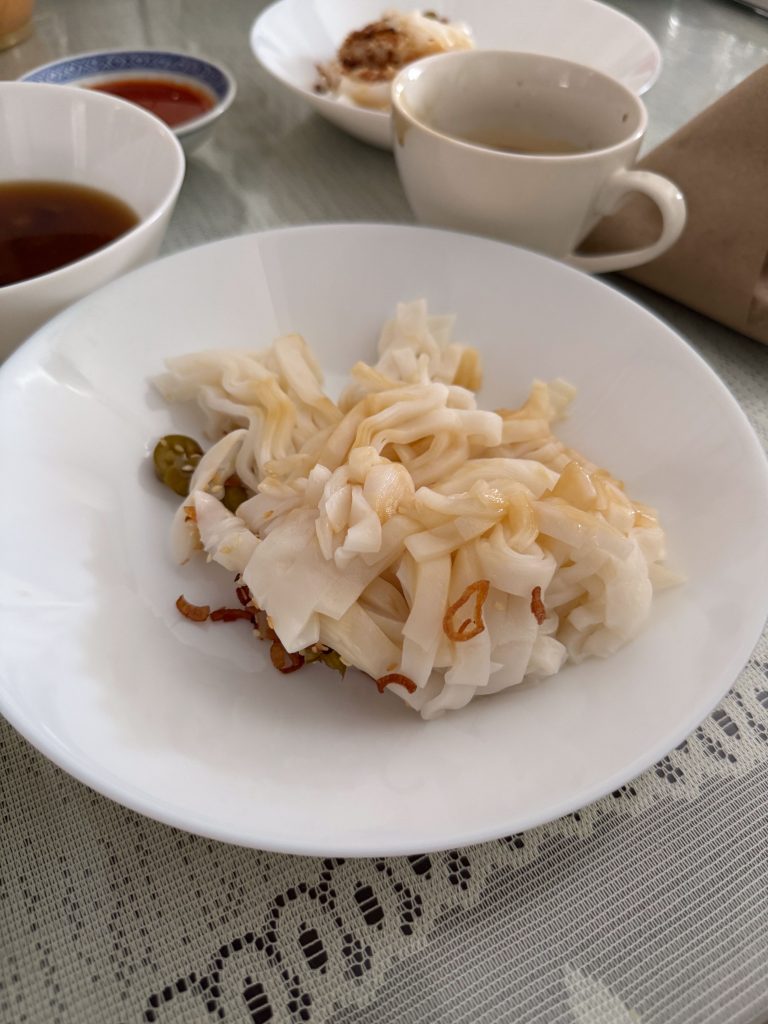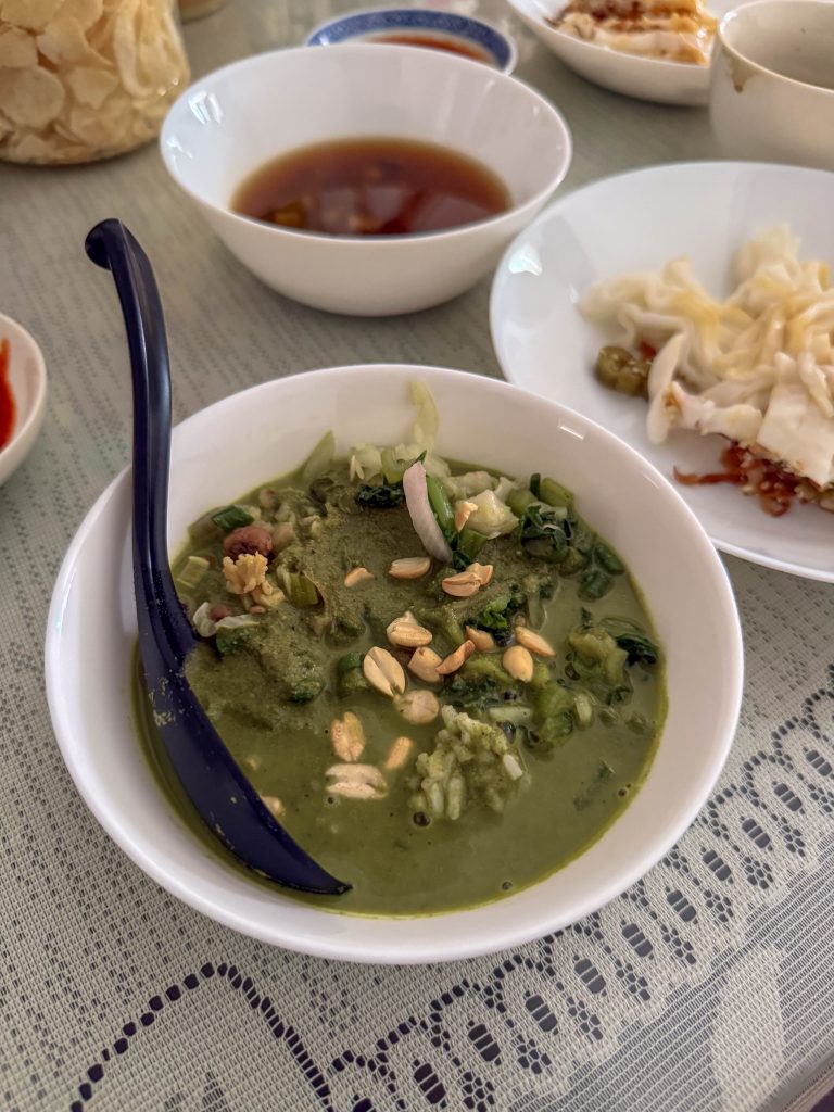 🇩🇪 Unser Frühstück bestand aus Chee Cheong Fun (CCF; das weiße Nudelgericht), Lei Cha (eine grüne Tee- und Kräutersuppe mit Gemüse und Getreide), Char Kway Teow (das braune Nudelgericht), Nasi Lemak (das eingepackte und ausgepackte Reisgericht) sowie Kuchen, die wir am Vortag in einer örtlichen Bäckerei gekauft hatten – genauer gesagt: Tiger Sting Cake (Tigerhautkuchen), Chiffonkuchen und schwarzer Sesamkuchen. Lecker!